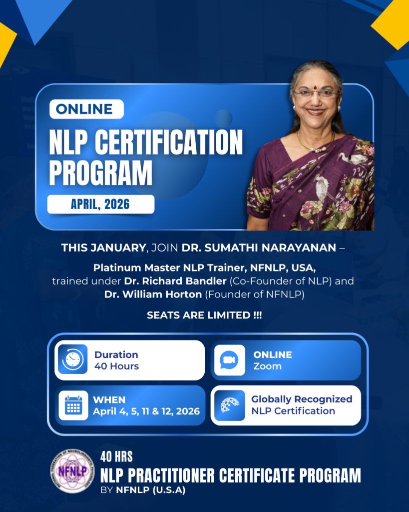 I wish to extend my heart felt thanks to Dr. Sumathi Narayanan for the excellent program on NFNLP. It was truly a wonderful and enriching experience. I found it incredibly beneficial for self-development and for realizing one’s own potential. I believe it can be helpful for everyone, be it a professional, a homemaker, or a student. I feel it’s a life skill that everyone could truly benefit from. Thank you Dr. Sumathi for enriching us with your expertise in this field. Grateful to all my co participants.